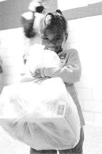 Nous avons commencé par le Lycée de Tarboro, l'abri le plus peuplé dans l'État, où des milliers de gens vivaient temporairement. Nous avons parlé avec le représentant d'affaires publiques de la Croix Rouge Américaine locale, Mme Carolyn Danks et le directeur du personnel du Comté d'Edgecombe, M. Mitchell Stensland, qui étaient enchantés d'apprendre que nous étions venus de loin pour aider personnellement à distribuer des affaires de secours et à réconforter les victimes. Leurs propres volontaires, ainsi que les membres de l'Association internationale du Maître Suprême Ching Hai, travaillaient côte à côte pour décharger un camion énorme rempli de ravitaillements qui incluaient de l'eau, des serviettes, des couvertures, de la nourriture, etc. Nous avons distribué alors les affaires de secours aux victimes des inondations, qui, plus que n'importe qui d'autres, acceptaient l'amour de Maître dans leur coeur. Nous avions aussi apporté des jouets pour les enfants que les volontaires de la Croix Rouge étaient enchantés de voir, car ils avaient attendu une cargaison qui n'était pas encore arrivée.