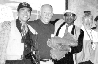 | Le représentant de la Croix Rouge américaine, Mme Carolyn Danks (à droite), Volontaire de la Croix Rouge américaine (second à gauche) et l'équipe de secours du Maître Suprême Ching Hai. |