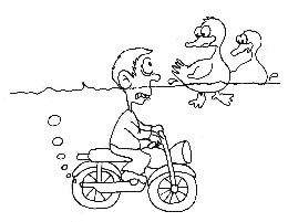 Un jour, un motocycliste voulut traverser une rivière, mais trouva le pont détruit. Il demanda à un garçon près de là, " La rivière est-elle profonde ? " L'enfant répondit " Non, elle n'est pas profonde. Vous pouvez la traverser sur votre motocyclette sans aucun problème. " L'homme pénétra dans la rivière. Mais en milieu de chemin, il se rendit compte qu'il avait de l'eau jusqu'à sa gorge ? Il était presque noyé. Il hurla au garçon " C'est une blague ? Tu es en train de me tuer. Pourquoi as-tu dis que ce n'était pas profond ? Il y a au moins cent mètre de profondeur. Si je vais plus loin je me noierai sans aucun doute ! Le petit garçon se gratta la tête et dit innocemment " Étrange ! Hier, j'ai vu des canards nageant dans la rivière, et l'eau leur arrivait seulement aux épaules ! "