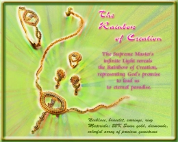 L'arc-en-ciel de la Création La lumière infinie du Maître Suprême révèle l'arc-en-ciel de la Création, représentant la promesse de Dieu de nous conduire au Paradis éternel. Collier, bracelet, boucles d'oreilles, et bague