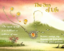 Le Soleil de la vie L'étincelle de la vie est aussi brillante que des milliards de soleils. Collier, boucles d'oreilles, et bague En or suisse 22 carats, diamants, pierres précieuses jaunes