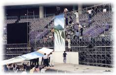 L'énorme échafaudage qui supporte le matériel nécessaire à la peinture du décor, derrière la scène où a lieu la conférence. |