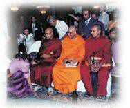 Une équipe Kandienne de danse et de tambour accueille Maître au Sri Lanka. | Maître s'incline humblement devant les moines Sri Lankais qui attendaient Sa conférence. |