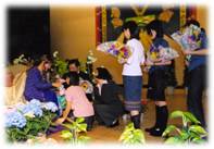 Quand la conférence s'est achevée, plusieurs enfants et adolescents ont offert des fleurs à Maître. Maître a gracieusement accepté, et a alors partagé toutes les fleurs et les fruits sur la scène avec le public.