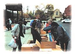 Jose] Le 20 novembre, par une matinée glaciale avant Thanks-giving, des amis pratiquants du centre de San Jose se sont rassemblés pour distribuer des provisions pour environ 100 sans abri. Tout s'est passé à merveille et les gens étaient très heureux de nous voir. Nous avons été dans un endroit appelé Urban Ministries qui offre aux sans abri des cafés chauds le matin et on peut s'asseoir et se détendre un moment. Une des différences entre cet endroit et là où nous avons été l'année dernière était que beaucoup de personnes de l'année dernière étaient des "sans abri", mais vivaient dans des refuges. Ces personnes semblaient pour la plupart vivre dehors, dans les rues.