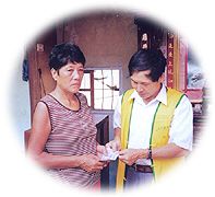 Le vieil homme, physiquement handicapé et sa femme, souffrant de glaucome, ont été réconfortés par leurs chaleureux et gentils voisins qui les ont aidés à réparer leur maison. Ceci nous a rappelé le bon côté des choses de la vie, là où les humains s'entraident et se soutiennent. Nous avons également rendu visite à une vielle dame qui nous a été extrêmement reconnaissante et qui a été touchée par notre présence. Lorsque nous sommes partis, elle nous a fait un signe de la tête les larmes aux yeux. La maison d'une veuve élevant seule ses deux fils handicapés a été à moitié détruite par le cyclone. Elle a aussi été très émue et reconnaissante envers nous. Plusieurs de ses voisins l'ont aidée à reconstruire et à réparer sa maison. Dans de tels cas, nous voyons vraiment comment les êtres humains peuvent s'entraider simplement et purement. À cette occasion, l'association internationale de Maître Suprême Ching Hai a donné 3000 $NT et une revue à tous les sinistrés et leur a, bien sûr, transmis l'Amour intense de Maître et Sa préoccupation pour eux.