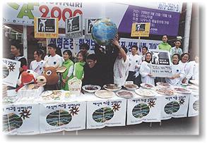 Etant donné que la diète végétarienne n'est pas populaire en Corée, et qu'il y a peu de végétariens stricts dans le pays, nos frères initiés ont participé activement et joué un rôle clé dans cette manifestation. Nous avons été rejoints par diverses organisations, telles que l'Eglise Adventiste du Septième Jour, les aliments coréens Sahmyook, le Mouvement général contre les mangeurs de viande de chien, les aliments Grain Zen, le réseau Internet coréen végétarien, le buffet végétarien SM (organisé par le centre de Séoul), VegeLove (également organisé par le centre de Séoul) et VegeFood, Inc. (organisé par un initié), afin de présenter les bienfaits du végétarisme.