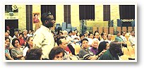| Des membres de l'auditoire posent plusieurs questions spirituelles exprimant ainsi leurs sincères aspirations à la Vérité. |