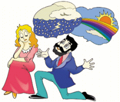 Un homme dit à une femme : "Ma chère ! Sans vous tout est sombre et lugubre. Les nuages s'amoncellent, et le vent chasse la pluie. Puis vient le chaud soleil ; vous êtes comme un arc-en-ciel pour moi." La femme demande : "C'est une demande en mariage ou un bulletin météo ?"