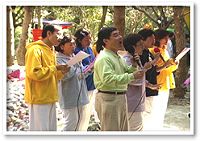 Le Chœur de Tainan a alors invité tous les initiés à chanter des chansons comme "Mère, Vous êtes si grande", "Les petites lanternes veulent rentrer à la Maison", "Chantez alléluia au Seigneur" et "Aller ! Allez ! Allez !" Le chœur a partagé aussi deux chansons spirituelles très spéciales dont les mélodies harmonieuses, les rythmes uniques et le flux musical imprégnés de sentiments ont fait vibrer les cordes sensibles de chaque auditeur. Nous avons espéré que ces mélodies jouées avec tant de sincérité transmettront à Maître ce message intérieur : nous essayerons de faire de notre mieux pour suivre Votre exemple et mettre Vos enseignements en action.