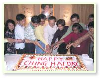 l'immense gâteau "Joyeux Jour Ching Hai", au milieu de tout le