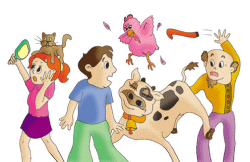 poulets, chat et chien) pour les mener dans sa maison et les