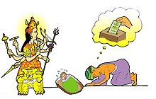 Durga. Plus que probablement, à cette époque, cette déesse n'avait pas quitté le monde depuis longtemps, donc elle était toujours efficace. Sa prière était : "Mon enfant est malade. Pouvez-vous le sauver ? S'il guérit, je l'amènerais ici pour vous vénérer. Je vous ferais aussi une offrande de cent roupies." Peut-être que cent roupies était beaucoup d'argent, l'équivalent de cent ou même d'un millier de dollars U.S d'aujourd'hui. L'argent avait plus de valeur à cette époque.