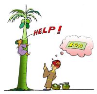 Cela paraissait très raisonnable, et puisque l'homme était une personne très économe, il alla à l'étalage des noix de coco pour acheter une noix de coco d'une roupie. Le vendeur de noix de coco lui dit : "Cinquante paises pour une noix de coco." Une roupie était l'équivalent de cent paises. L'homme dit : "Quoi ? Comment se peut-il que ce soit si cher ? Vendez m'en une pour quarante paises, d'accord ?" Le vendeur dit : "Si vous espérez un si bas prix, vous devez aller chez le grossiste." L'homme marcha donc un long chemin vers le grossiste. Là, les noix de coco étaient vraiment à quarante paises. Il marchanda encore: "J'ai fait un si long chemin jusqu'ici. Vous allez encore me vendre une noix de coco pour quarante paises, alors ce n'est pas moins cher ! Vous feriez mieux de me faire un prix de vingt paises chacune." Le vendeur rit et dit : "Si vous voulez vraiment en avoir une pour vingt paises, alors vous devez vous rendre à la plantation. C'est seulement moins cher à cet endroit." Entendant cela, l'homme décida de faire son achat à la plantation.