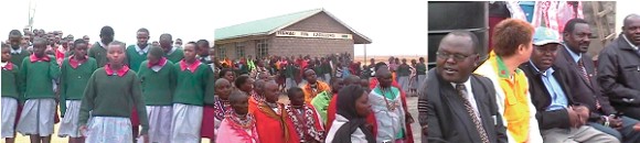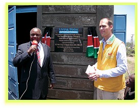 Devant le local à pompe sur lequel une plaque de remerciement a été apposé (de gauche à droite) : Mme Jemima Gichungu, directrice du programme pour prisonniers ; M. Ogeto Ngare, fonctionnaire responsable de la Prison de haute sécurité de Nakuru ; un représentant de l'Association Internationale de Maître Suprême Ching Hai ; M. Donald K. Gichane, manager opérationnel de Living Water International ; M. S.M.F. Karioki, président du programme pour prisonniers. |
