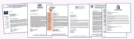 Lettres de remerciement à Maître Suprême Ching Hai de la part de la Fondation vietnamienne pour les enfants aveugles, de Giving It Back to Kids, des Services Humanitaires pour les Enfants du Viêt-Nam, de la Fondation d'assistance prothétique, du Programme d'aide pour les enfants du Vietnam et de Vietnam Relief Effort. |
