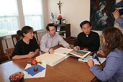 De droite à gauche: Un membre de notre Association interviewe le Père Thuan Hoang (Président de la Fondation des enfants vietnamiens aveugles) et Mme Desta White (BVCF). |