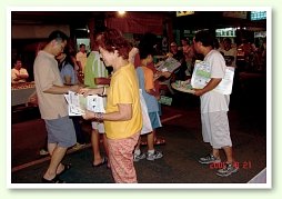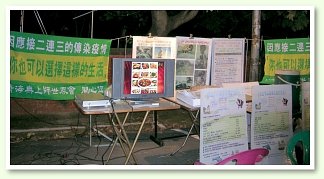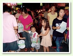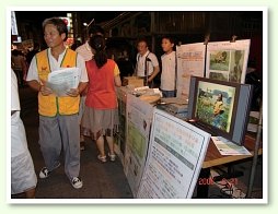 ![]() Soutenu par le Conseil municipal Tainan, le Festival international des Arts Chihsi s'est tenu dans le Jardin de Culture du Temple de Confucius du 21 au 31 juillet. A cette occasion, le Centre de Tainan a organisé trois nuits de distribution de prospectus, de stylos et d'éventails Mode de vie alternatif. Lors du concert rock organisé la deuxième nuit, des centaines de gens agitaient leurs éventails Mode de vie alternatif au rythme de la musique. Cette scène était vraiment spectaculaire !