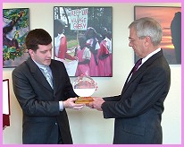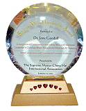 Par le groupe d'informations de Virginie (à l'origine en anglais) Le 12 février de l'année d'Or 4 (2007), des amis initiés du Centre de Virginie sont allés à Arlington en Virginie, pour remettre au Dr. Jane Goodall le Prix du brillant leadership mondial en reconnaissance de ses efforts remarquables et de son leadership éclairé. Outre la plaque, ils ont aussi donné une lettre de félicitation de la part du Maître et un chèque de 10 000 $US à son organisation humanitaire à but non lucratif, l'Institut Jane Goodall pour la recherche, l'éducation et la conservation. Nous avons vraiment été fascinés par les nombreuses images des travaux du Dr. Goodall et la statue de bronze d'un chimpanzé placées à l'entrée de l'Institut. Elles représentent la simplicité, le dévouement et l'humanitarisme. Comme cela a été expliqué dans la Revue n°174, le Dr. Goodall fait autorité dans le monde concernant l'étude des chimpanzés ; sa recherche a transformé les perceptions scientifiques des relations entre les humains et les animaux. Son livre récemment publié « Harvest for Hope: A Guide to Mindful Eating » (Moisson d'Espoir : Guide pour une alimentation réfléchie) promeut aussi le végétarisme et le changement dans la manière de produire et de consommer la nourriture. Il présente de nombreuses façons de créer un changement positif pour l'avenir de nos enfants et de la planète.