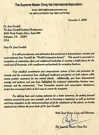 Au fil des ans, le Dr. Goodall est devenu défenseur de l'environnement et activiste social, appelant les gens à protéger les animaux et l'environnement, et à promouvoir l'éducation humanitaire des jeunes. En 1977, elle a fondé l'Institut Jane Goodall pour la recherche, l'éducation et la conservation pour fournir l'appui en cours pour la recherche des champs sur des chimpanzés sauvages. Aujourd'hui, la mission de l'Institut de Jane Goodall est de renforcer le pouvoir des individus pour qu'ils prennent, en connaissance de cause, des initiatives compatissantes visant à améliorer l'environnement de tous les êtres vivants. L'Institut est un organisme de premier ordre en matière de protection des chimpanzés et de leurs habitats ; il a été largement reconnu pour ses programmes innovants de développement et de protection de communauté et des programmes de développement mis en œuvre en Afrique, ainsi que pour son programme éducatif Roots & Shoots, qui a désormais été déployé dans plus de 70 pays. Malgré son emploi du temps chargé et ses innombrables projets, le Dr. Goodall a toujours l'air paisible. La source de sa sérénité est mentionnée dans son livre « Reason for Hope: A Spiritual Journey » (Raison d'Espoir : Un voyage spirituel), dans lequel elle relate une de ses expériences : en visitant une église, elle a entendu une musique intérieure qui lui a apporté un sentiment de bonheur éternel. Elle considère que cette expérience spirituelle intérieure et d'autres expériences intérieures du son la connectent au pouvoir divin, l'inspirant pour travailler comme messagère de Dieu pour faire passer le message selon lequel les humains devraient avoir de bonnes relations avec le règne animal. Ainsi sa foi solide en Dieu et son cœur d'amour pur envers tous les êtres l'aident à accomplir ce travail désintéressé inconditionnel pour le monde. Le Dr. Goodall est un merveilleux exemple d'une personne qui aime, courageux et humble. Elle a reçu de nombreux prix, comme le prix Gandhi pour la non-violence. En avril 2002, le Secrétaire général M. Annan a nommé le Dr. Goodall « messagère de la paix » des Nations unies. Elle a aussi publié de nombreux livres pour adultes et enfants. Du fait de son emploi du temps chargé, le Dr. Goodall n'a pu être présente lors de la remise du prix. C'est donc le Vice-président de la communication qui nous a chaleureusement reçus avant que nous rencontrions M. Bill Johnston, le président de l'Institut Jane Goodall. Lors de la réception, ce dernier a expliqué, au nom du Dr. Goodall, que « c'est un merveilleux honneur », et nous a dit que l'argent aidera l'Institut à créer « des sources de revenus à travers le monde. » Après la remise du prix, un membre du Centre de Virginie a eu l'occasion de discuter de l'Institut Jane Goodall avec M. Johnston. Celui-ci a fièrement rappelé que cette année était le 30e anniversaire de l'Institut et a expliqué que des événements seraient organisés dans le monde entier pour célébrer tous les grandes réussites de l'Institut qui concernent notamment la protection des chimpanzés et des forêts africaines. M. Johnston a estimé que la déforestation constituait la plus grande menace à l'égard des chimpanzés et favorisait le commerce de la viande car les chasseurs tuent et mangent les animaux, y compris les chimpanzés. M. Johnston nous a aussi rappelé que le Dr. Goodall est végétarienne et que des repas végétariens sont toujours servis lors des réunions du Conseil d'administration. M. Johnston a poursuivi en expliquant que les enfants et l'éducation sont les grands amours du Dr. Goodall. Ainsi elle a créé le programme Roots & Shoots pour permettre aux enfants de tous âges d'aider leur propre communauté, d'aider les animaux et d'aider à préserver l'environnement. Le nom de ce programme trouve son explication dans le fait que les racines (roots) constituent une base solide, tandis que les pousses (shoots) peuvent percer le béton pour atteindre le soleil. En conclusion, M. Johnston a déclaré : « Personne ne peut remplacer Jane. Elle est unique. » En quittant l'Institut, nous nous sentions tous sentis honorés et bénis d'avoir fait partie de cet événement envoyé par Dieu. Pour plus d'informations, consultez :
