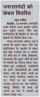 Rajasthan Patrika, Inde, le 14 février 2007 (à l'origine en hindi) Cet article d'un journal local, ayant pour titre : « Distribution de couvertures aux indigents », explique qu'avec l'appui de l'Association Internationale de Maître Suprême Ching Hai, la distribution de 500 couvertures a permis de protéger les pauvres contre un froid insupportable. |