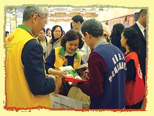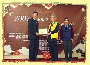 En signe de gratitude pour notre contribution de long terme aux gens moins chanceux, le Magistrat Chou Hsi-wei du comté de Taipei a remis un certificat de remerciement à notre Association à l'occasion d'un dîner de célébration de fin d'année qui s'est tenu le 12 février de l'année d'Or 4 (2007). Certains de membres de notre Association ont été invités à s'asseoir à la table principale aux côtés du Magistrat de comté, du Directeur du Bureau des Affaires Socials Li Li-chuan et du Sous-directeur Chan Yu-jung et du Président Huang Hsing-hua de l'Association Volontaire.