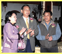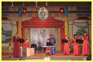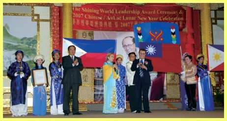 That evening, a Shining World Leadership Award presentation ceremony was held at the Hall of Sacred Love, honoring the former President of the Philippines, Fidel Ramos; President of the Gusi Foundation, Mr. Manuel Morato; and Senator Heherson Alvarez, for their philanthropic deeds in helping the Aulacese asylum seekers many years ago. The local dignitaries that attended this grand ceremony were Mr. Gu Min, UNESCO committee member; Mr. Su Wen-hui, Chief of Miaoli Civil Administration Bureau, and his wife; Mr. Huang Lung-fu, Chief of the Religion and Traditional Customs Department; Mayor of Hsihu Township, Mr. He Mu-yan and his wife; Ms. Yang Xiu-xia, former Hsihu Township Mayor; Mr. Wu Jun-yi, Village Chief of Sanhu Village; Mr. Gu Mu-xian, Director of Hsihu Township Farming Society; Mr. Zhu Zeng-cheng from the Police Department; Town Citizens' Representatives Mr. Zhu Qiu-rong and his wife; Ms. Huang Mei-ying, former Director of the Taipei County Volunteer Worker Society; and many others.