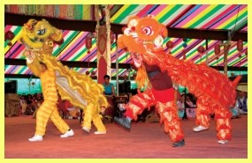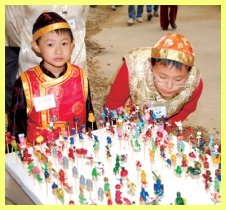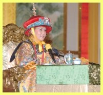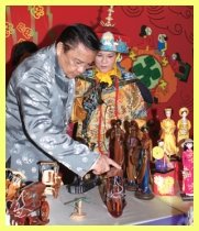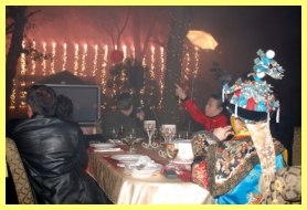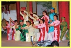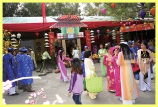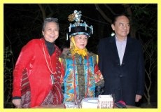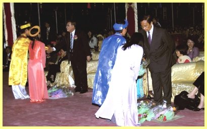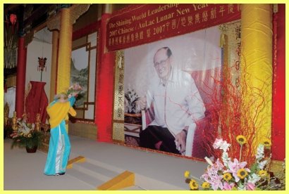 Fellow initiates from all countries, dressed in the most colorful traditional dress of different nations, celebrated the arrival of Golden Year 4. In a garden-party style, all fellow initiates and guests were treated to a sumptuous feast of New Year delicacies from different countries. Wearing the costume of the Ching Dynasty Emperor, Master arrived in a sedan chair and waved to greet everyone. She stopped at various food booths along the way to taste the snacks with the guests. When She came to the 'Aulac Village,' She was very happy to see some New Year delicacies and cultural artworks that She remembered from Her youth. Master explained each item in detail to the guests and cordially presented many of them as gifts.