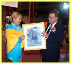 After that, the Lunar New Year celebration program began. The high standard of performances from fellow initiates in various countries won thunderous cheering and applause from the entire audience. After the performance program, Ms. Cecile Alvarez, on behalf of Mr. Joe Lad Santos and Mr. Ricardo Nolasco from the Filipino Institute of Komiks Arts and Sciences, presented a plaque of appreciation to Master, together with samples of paintings by some Filipino artists. She also gave Master a videotape of a program that had been hosted by Mrs. Alvarez, which reported Master's compassionate actions in helping the disaster victims in the Philippines. Mrs. Alvarez also offered Master a piece of fabric from a Muslim community, symbolizing that "regardless of race and color, there is a common humanity," as well as her gratitude for assisting the Earthsaver's Dream Ensemble.