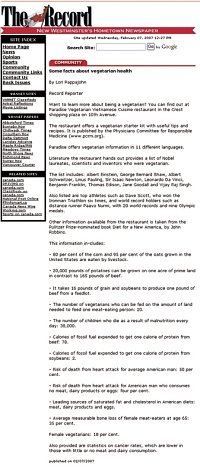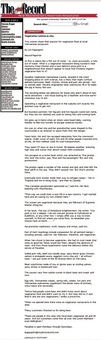 Paradise Vegetarian Noodle House est un restaurant végétarien du Grand Vancouver (Colombie britannique) ouvert et tenu par deux initiés depuis trois ans. Tous les deux ou trois mois, une critique très positive non sollicitée très positif de leur restaurant paraissait dans l'un des deux grands journaux de Vancouver. Depuis peu, les deux initiés qui possèdent le restaurant constatent que l'engagement de leurs clients dans le végétarisme se renforce. Les gens entrent, goûtent les plats, reviennent et expliquent qu'ils sont devenus végétariens ! Dans leur restaurant, des recettes végétariennes et des informations (prospectus Mode de vie alternatif et livrets-échantillons traduits en onze langues) sont mises dispositions à des clients. Le restaurant se situe entre deux villes qui composent le Grand Vancouver. Les journaux de ville de New Westminster et de Burnaby ont publié, respectivement les 7 et 9 février, de très élogieux articles sur leur restaurant. Accessibles sur Internet, ces articles portent notamment sur les prospectus Mode de vie alternatif et les enseignements de Maître Suprême Ching Hai à propos de la compassion envers toutes les créatures vivantes et des bienfaits du végétarisme en général. Les journaux sont lus par plus 65 000 ménages et sont mis à disposition dans de nombreux lieux publics. Le Ciel végétarien est bel et bien ici et maintenant, et de plus en plus de gens l'apprécient !