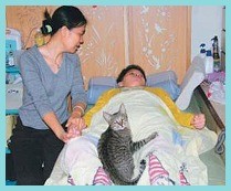 Une chatte masseuse et un chien de compagnon auraient aidé un patient comateux de quinze ans dans son rétablissement. La famille du garçon formosan, qui a récemment pu déplacer ses mains et remuer ses orteils, a attribué ce miracle au chien et à la chatte qu'ils avaient adoptés. Mme Zeng a expliqué que son fils a été diagnostiqué, une année plus tôt, avec une tumeur cérébrale maligne au cours de sa première année de lycée. Après avoir commencé à faire de la chimiothérapie, son système sanguin a été gravement infecté, menaçant presque de mettre fin à sa vie. Dans le coma et ayant un niveau très bas de conscience, l'équivalent de 3 à l'échelle de coma de Glasgow, on a déclaré qu'il est entré à un état végétatif. Bien que la tumeur ait été enlevé et qu'il ait subi une série d'opérations chirurgicales, il est resté paralysé et a perdu sa capacité de parler. Il y a environ deux mois, Mme Zeng a adopté une chatte perdue, Amy, comme compagnon pour son fils cloué au lit. Chaque jour, Amy se pelotonnait sur les cuisses de son fils, ses pattes arrière faisant pression alternativement, comme si elle lui donnait un massage. Parfois elle répétait ce processus plusieurs fois par jour, la durée d'un massage était au maximum cinq minutes. Elle rivalisait même avec Mme Zeng pour donner au garçon un massage, montrant son mécontentement si elle était rejetée. La famille avait un vieux chien nommé Grosse Tête. Quand les membres de famille sortaient le garçon pour une promenade dans un fauteuil roulant deux fois par jour, ils plaçaient la laisse de Grosse Tête autour des doigts du garçon. En voyant son jeune maître, Grosse Tête léchait ses mains et ses pieds, et s'abstenait de s'agiter. Pendant ces vacances de Nouvel An lunaire, un miracle est arrivé. Le garçon était capable de lever un peu ses mains et de remuer ses orteils. Le docteur de rééducation a dit qu'il avait beaucoup progressé, mais sa famille a attribué ce miracle aux relations affectueuses entre leur chien, leur chat et le garçon, qui a ainsi bénéficié d'un pouvoir guérisseur.