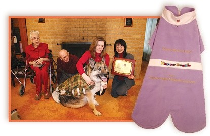Initié de Toronto, le Canada et Rochester, NEW YORK a voyagé à Alden, NEW YORK au Sanctuaire d'Animal de Forêt Enchanté pour présenter Shana avec sa plaque de Récompense(Sentence) de Héros de Monde Brillante et deux tradition faite des vestes "de Héros" conçues par le Maître Suprême Ching Hai. Ils ont aussi apporté US$2,000 du Maître pour les dépenses de Shana et un assortiment d'alimentation de chien végétarienne, des plaisirs et "des os" végétariens. L'initié trouvé que Shana est tout à fait grand et serait un chien très intimidant pour se rencontrer(se réunir) si elle n'était pas si paisible et aimante dans son comportement! Elle était à l'extérieur quand l'initié est arrivé et elle a griffé à la porte à être fait entrer pour les saluer. Avec sa queue remuant furieusement, elle les a salués un à un de baisers et lèche. Quand Shana a été présenté avec ses vestes, il était impossible de mettre ses pieds par les ouvertures pour mettre les vestes correctement. Tristement, ses pieds sont toujours blessés(lésés) de tout le creusement pendant son sauvetage du Fertigs il y a cinq mois. Il était touchant de voir comment le chien s'est sacrifié pour creuser par la neige et la saleté pour sauver(économiser) le couple. L'initié aussi découvert que Shana s'était récemment prouvé pour être un héros de nouveau - deux fois! Juste une semaine avant leur visite, l'alarme de fumée était partie au milieu de la nuit au Fertigs à la maison. Ils ne pouvaient trouver rien mal et ne pouvaient pas sentir la fumée, donc ils sont retournés au lit. Shana a aboyé et a aboyé, essayant d'obtenir leur attention. En pensant qu'elle a juste voulu aller à l'extérieur, Mme. Fertig lui a dit de se calmer et attendre jusqu'au matin. Finalement, Shana a en réalité tiré Mme. Fertig du lit et a essayé de traîner son extérieur. Le Fertigs s'est rendu compte que Shana ne serait pas ignoré et décidé qu'ils devraient appeler les pompiers. Les pompiers sont arrivés, découvrant que le four était au feu. Le Capitaine de pompiers a dit que le four aurait éclaté dans 10 minutes. Le Fertigs était reconnaissant que Shana était si diligent et implacable dans ses efforts de les avertir. Seulement un mois avant que cela, quelques personnes prenant des classes au Sanctuaire n'ait apporté un chien et son chiot avec eux et les ait laissés(quittés) dans leur voiture. Ils ont appelé le Fertigs au milieu de la nuit, disant leur chiot a été perdu. Ils ont pensé que le chiot petit, noir pourrait s'être esquivé de la voiture au Sanctuaire sans quelqu'un remarquant. Tandis que Mme. Fertig les a grondés pour mettre en danger le chiot en le laissant(quittant) dans la voiture au milieu de l'hiver froid de glace, Shana a commencé à aboyer à la porte. Quand le Fertigs la libère, elle a couru directement pour un petit ruisseau derrière la propriété. Le chiot était dans le flot froid glacial. Shana l'a pris par sa tête et lui a apporté directement en arrière à la maison. M. et Mme. Fertig l'ont séché et l'ont réchauffé jusqu'à ce qu'il se soit remis. Ils ont dit qu'ils n'auraient jamais trouvé le chien par eux au milieu de la nuit. Ce chien spécial s'est montré pour être exceptionnellement le souci et l'âme capable qui mérite vraiment le titre "le héros". C'était avec le grand honneur qui l'initié Shana présenté avec elle "Brillant la Récompense(Sentence) de Héros du Monde."