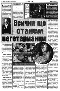 Troud, un journal bulgare important, a publié un article d'une page intitulé « Chacun deviendra un végétarien », basé sur le livre de Jeremy Rifkin « Le Rêve européen : Ou comment l'Europe se substitue peu à peu à l'Amérique dans notre imaginaire ». A droite de l'article figure la photo de Paul McCartney (chanteur végétarien) et il est écrit : « NON à la viande ! » Le nom d'autres végétariens célèbres, comme le président de la Slovénie, Gwyneth Paltrow, Léon Tolstoï et Léonard de Vinci, est également mentionné. C'est une grande nouvelle pour nous, parce que cette page entière porte sur le végétarisme et elle est très positive ! Nous sommes plus qu'heureux de voir les changements spectaculaires qui se manifestent en Bulgarie.