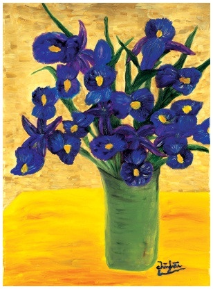 Tandis que je lisais "Iris", un conte de fées écrit par Hermann Hesse, les premières pages m'ont immédiatement rappelé le tableau d'Iris peint par le Maître. Les belles fleurs bleues et pourpres avec un arrière-plan couleur or qui crée un effet surréaliste d'une aura radiante captivent le spectateur. Les iris ronds débordant de vie et d'énergie semblent sur le point d'éclater de rire et de vous entraîner dans des aventures enfantines sans fin. On a l'impression que les fleurs s'ouvrent à notre intention, pour nous réconforter autant que pour remplir nos cœurs d'un enthousiasme innocent et sincère pour l'existence. C'est exactement ce que la fleur d'Iris représente dans l'histoire de Hermann Hesse : un symbole d'enfance, « une porte ouverte par laquelle l'âme, si elle est prête, peut entrer dans la partie intérieure du monde, où vous et moi, jour et nuit formons un tout. » Iris raconte l'histoire d'un jeune garçon qui a adoré les iris du jardin de sa famille. Bien que de nombreuses autres fleurs se trouvaient dans ce jardin, l'iris revêtait une importance toute particulière pour lui, parce qu'« elle est devenue tout ce qui valait la peine d'être contemplé et tout ce qui était miraculeux. » Il regardait souvent fixement l'iris et se trouvait comme transporté dans un état de rêve d'où il percevait l'unité dans l'univers et la félicité dans l'existence. Cependant en grandissant, ce petit garçon devenu un homme s'est engagé passionnément dans le monde extérieur oubliant totalement ce que l'iris avait symbolisé. Plus tard, devenu un savant célèbre, un professeur estimé par beaucoup, il se trouvait malheureux et mécontent dans son cœur. Ce sentiment commença à se dissiper quand il vint à s'attacher à une femme remarquable nommée Iris. Son nom lui rappelait quelque chose de profond, de lointain, d'important ; cependant il ne réussissait pas à définir exactement ce qu'il ressentait. Finalement, il demanda à Iris de l'épouser mais Iris rejeta sa demande en déclarant : « Je peux vivre sans fleur et aussi sans musique... cependant, il y a une chose dont je ne peux me passer et dont je n'essayerais jamais de me priver : je ne veux pas vivre, ne serait-ce qu'un jour, si la musique de mon cœur n'est pas au centre de tout ce que je fais. » Iris exigea qu'il trouva son moi intérieur avant d'accepter sa proposition. Avec hésitation, l'homme consentit et se lança dans un périple intérieur de découverte de soi. Quelques années plus tard, l'homme avait acquis une nouvelle sensibilité à la vie qui l'a attendri. Avant la fin de sa mission, Iris tombée malade se mourait. Avant son décès, elle lui donna un iris en lui disant : « Cherchez-moi... cherchez l'iris. Alors vous viendrez à moi. » Il continua à chercher. Finalement, l'homme redécouvrit son rêve d'enfance, et reprit goût à la vie grâce à l'iris. « Il se mit à chantonner et ses chemins le menèrent tout doucement vers son foyer. » Je me demande si cela est une des raisons pour laquelle le Maître a intitulé cette peinture « Les fleurs du Cœur ne flétrissent jamais », car il s'agit d'un cœur d'enfant vraiment libre et qui représente le vrai Soi. En ce sens, le conte « Iris » écrit par Hermann Hesse et le tableau du Maître dépeignent une même vérité s'inscrivant au-delà du temps et de l'espace.