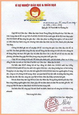 Le siège social central du fonds d'aide à l'éducation et d'action humanitaire de l'Association centrale du Vietnam pour la promotion du développement éducatif Vous remercie respectueusement, ainsi que Votre Association, pour le cadeau de 30 000 $US offert le 5 mars 2007. Cela nous permettra de servir les moins nantis de façon à ce que les jeunes enfants aient la possibilité d'étudier, et de mener nos autres programmes humanitaires dans les provinces et les villes du Sud-Vietnam. Nous apprécions grandement Votre aide et Votre soutien, et celui de Votre Association pour Votre assistance dans ces efforts humanitaires et éducatifs. Nous avons enregistré Votre contribution généreuse dans notre livre d'or. Nous utiliserons cet argent dans le but de mener des actions éducatives et humanitaires, selon Votre désir, notamment dans les régions Sud où des problèmes de développement de l'éducation se posent. Notre association est une organisation non gouvernementale à but non lucratif, qui sert 54 communautés ethniques différentes de frères et sœurs vietnamiens à travers nos deux domaines d'action que sont l'éducation et l'aide humanitaire. Notre plan pour l'année 2007 est de lever des fonds pour offrir 10 000 bourses aux étudiants exceptionnels désavantagés financièrement (1 million de dongs vietnamiens par étudiant), de construire des écoles dont deux écoles secondaires, et de construire 100 « maisons de reconnaissance » pour les pauvres dans les régions isolées. Par conséquent, nous apprécions particulièrement l'attention, l'appui, les matériaux et le souci des bienfaiteurs charitables et d'autres associations du monde entier. Je voudrais Vous transmettre nos sincères remerciements et notre gratitude la plus profonde de la part du siège social central du fonds d'aide à l'éducation et d'action humanitaire de l'Association centrale du Vietnam pour la promotion du développement éducatif. Nous souhaitons, à Vous et à Votre Association, une bonne santé et beaucoup de succès dans vos œuvres caritatives durant l'année à venir. Respectueuses salutations,