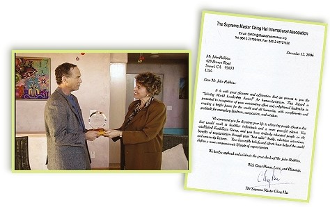 Interviewer 2 : Merci de nous recevoir ici. Votre prix Pulitzer pour le livre « Se nourrir sans faire souffrir » a vraiment révolutionné la conscience publique sur une nutrition appropriée et la sagesse d'un régime à base de plante. En reconnaissance pour vos efforts inlassables pour promouvoir le végétarisme et sauver la vie d'innombrables animaux innocents innombrables, j'ai l'honneur de vous présenter de la part de Maître Suprême Ching Hai, le Prix du brillant leadership mondial pour votre humanitarisme. Merci d'être un modèle de sagesse et de compassion pour des millions des gens à travers le monde. J : Merci. Je l'accepte de la part de tous ceux qui luttent pour un avenir humain, joyeux et durable. J : Merci à Vous (Maître Suprême Ching Hai) pour cette récompense et plus significativement, pour le travail que Vous avez accompli, ce que Vous faites, le fait que Vous encouragiez autrui à agir pour que l'humanité devienne consciente de sa responsabilité – vivre une vie de compassion, et ce faisant honorer l'esprit de tous les êtres.