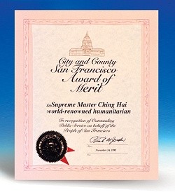 | En 1993, le Maire Frank Jordan de San Francisco, Californie, Etats-Unis, a remis à Maître Suprême Ching Hai le Prix du mérite en reconnaissance de Sa contribution humanitaire au monde. |