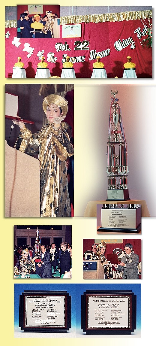 | En 1994, les Gouverneurs de six Etats du Midwest (Illinois, Iowa, Wisconsin, Kansas, Missouri et Minnesota), ont attribué à Maître Suprême Ching Hai le Prix du leadership spirituel mondial et des statues de bronze de Maître Suprême Ching Hai. Le 22 février a été désigné le « Jour de Maître Suprême Ching Hai ». M. Chen Hung Kwang, le Secrétaire général de la World Cultural Communication Association et les Gouverneurs de six Etats du Midwest ont remis à Maître Suprême Ching Hai un prix de mérite pour Sa contribution aux victimes du Midwest (Etats-Unis) et une autre récompense pour les actions de secours menées en direction des victimes des éruptions volcaniques du Mont Pinatubo aux Philippines.