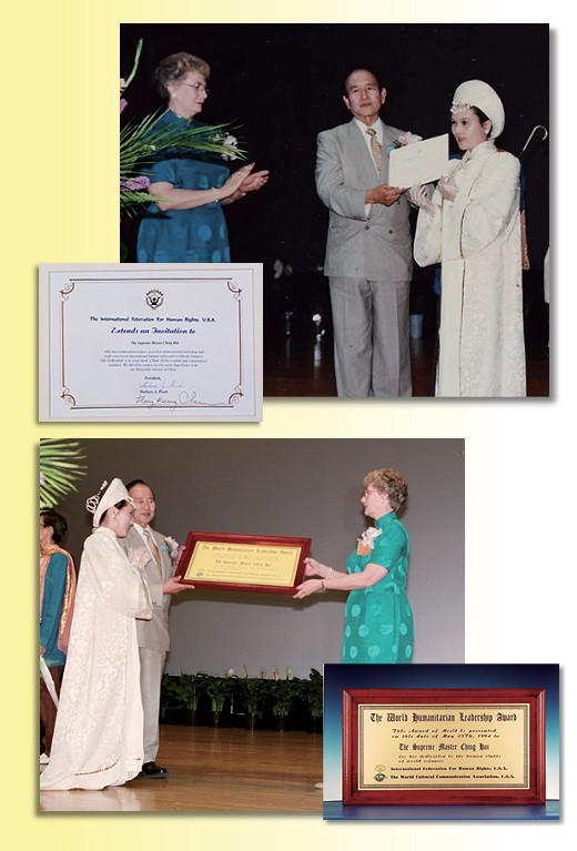 | En 1994, Mme Barbara J. Finch, Directrice de la Fédération Internationale des droits de l'homme et M. Chen Hung Kwang, Secrétaire Général de la World Cultural Communication Association ont remis à Maître Suprême Ching Hai le Prix du leadership humanitaire mondial. Ils L'ont aussi invitée à être Conseillère Honorable en Chef de la Fédération Internationale pour les droits de l'homme.