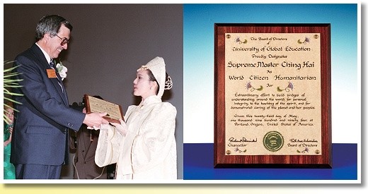 | En 1994, le Dr. Richard Schneider – Chancelier de la Radio pour la Paix Internationale et de l'Université de l'Education Mondiale – a attribué le Prix Humanitaire du Citoyen du Monde à Maître Suprême Ching Hai
