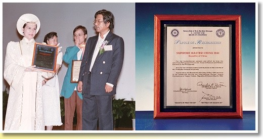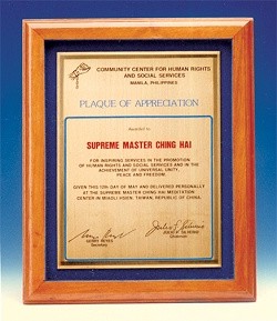 | En 1991, le centre municipal des droits de l'homme et des services sociaux de Manille aux Philippines, a décerné à Maître Suprême Ching Hai le Prix de la promotion des droits de l'homme (et de l'accomplissement de l'unité universelle) |