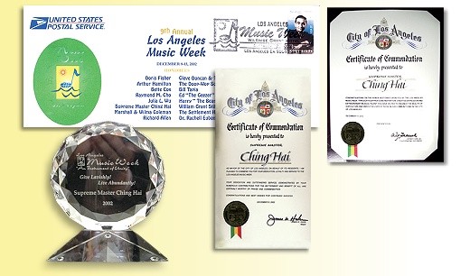 | En 2002, la 9ème Semaine de la Musique de Los Angeles et la Ville de Los Angeles ont honoré Maître Suprême Ching Hai en tant qu'artiste. Ils ont aussi remis au Maître le Certificat de Gratitude signé par le Maire de Los Angeles et une plaque en cristal pur.