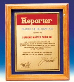 | En 1991, le Filipino Reporter a honoré Maître Suprême Ching Hai en Lui décernant le Prix de l'action humanitaire exemplaire pour Ses actions de secours menées en direction des victimes de l'éruption volcanique du Mont Pinatubo. |