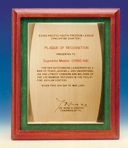 | En 1991, le Dr. René G. Santos, Président de Ligue de la Liberté des Jeunes asiatiques du Pacifique, a présenté une plaque de reconnaissance à Maître Suprême Ching Hai pour Son leadership remarquable en tant que personne de paix, de bienveillance, de compréhension et de préoccupation extrême et d'attention envers les réfugiés aulaciens dans les centres d'asile philippins. |