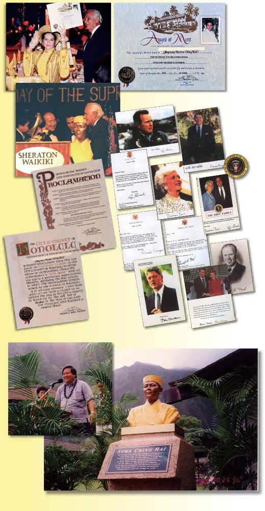 En 1993, le Maire de Honolulu, Etats-Unis, a attribué le Prix de la Paix Mondiale et une Citoyenneté Honoraire à Maître Suprême Ching Hai, et a annoncé le 25 octobre comme le « Jour de Maître Suprême Ching Hai ». Il a aussi présenté une statue commémorative de bronze de Maître Suprême Ching Hai, qui a été par la suite exposée de manière permanente sur une place publique de la Ville de Honolulu pour que chacun puisse l'admirer.