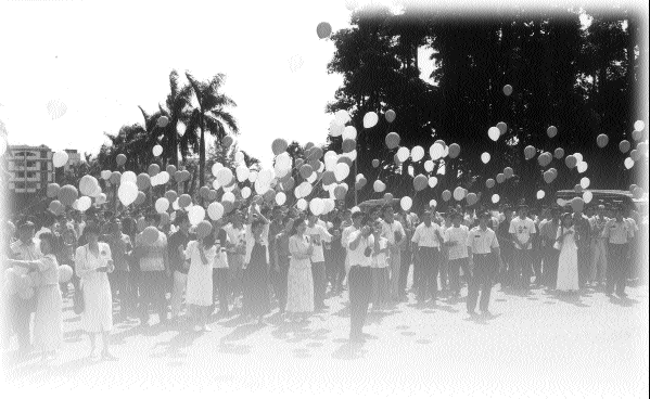 Le moment le plus émouvant de cet événement a été quand quelqu'un a lu tout haut une prière pour tous ceux qui étaient présents, pendant qu'on entendait la cassette de Maître chantant : " Namo Guan Yin Bodhisattva ". Les participants ont baissé la tête et ont prié en silence, et certains de ces homme durs ont pleuré du plus profond de leur cœur. Les initiés ont réellement senti les bénédictions de Dieu et des Saints sur l'assemblée. L'amour de Maître a fait fondre des cœurs qui avaient été longtemps glacés. L'événement s'est terminé par un lâché de ballons dans le ciel. Quand ces mains trapues ont relâché les petits ballons, les laissant s'élever dans le ciel, ce fut un très beau spectacle. Nous souhaitons que le monde puisse être à l'avenir en paix, et où nous pourrions tous vivre libres et sans soucis, comme si nous étions au paradis.