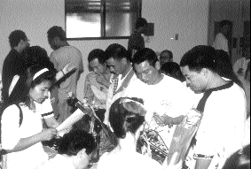 ![]() | Tandis qu'on entend la cassette des chants de Maître, les participants ferment leurs yeux pieusement et prient |